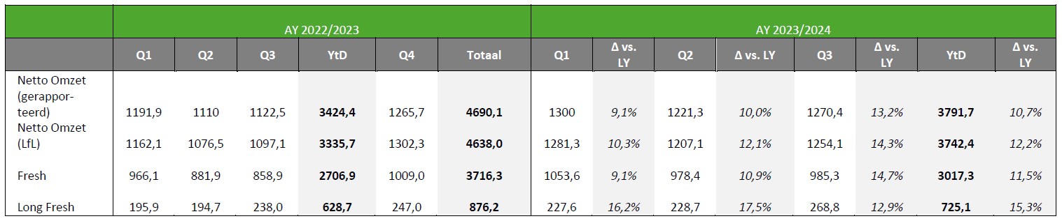 De omzet van de Greenyard Groep steeg in het derde kwartaal, eindigend op 31 december 2023, met 12,2% van € 3 335,7 m naar € 3 742,4 m, en is daarmee in lijn met de verwachte omzet van € 4 900 m voor het volledige boekjaar dat afloopt eind maart 2024. Dit betekent een verdere versnelling van de groei in het derde kwartaal ten opzichte van de eerste helft van het boekjaar. Van de 12,2% groei is 9,6% te danken aan prijsverhogingen (in beide segmenten) en 2,6% aan volumestijgingen.
